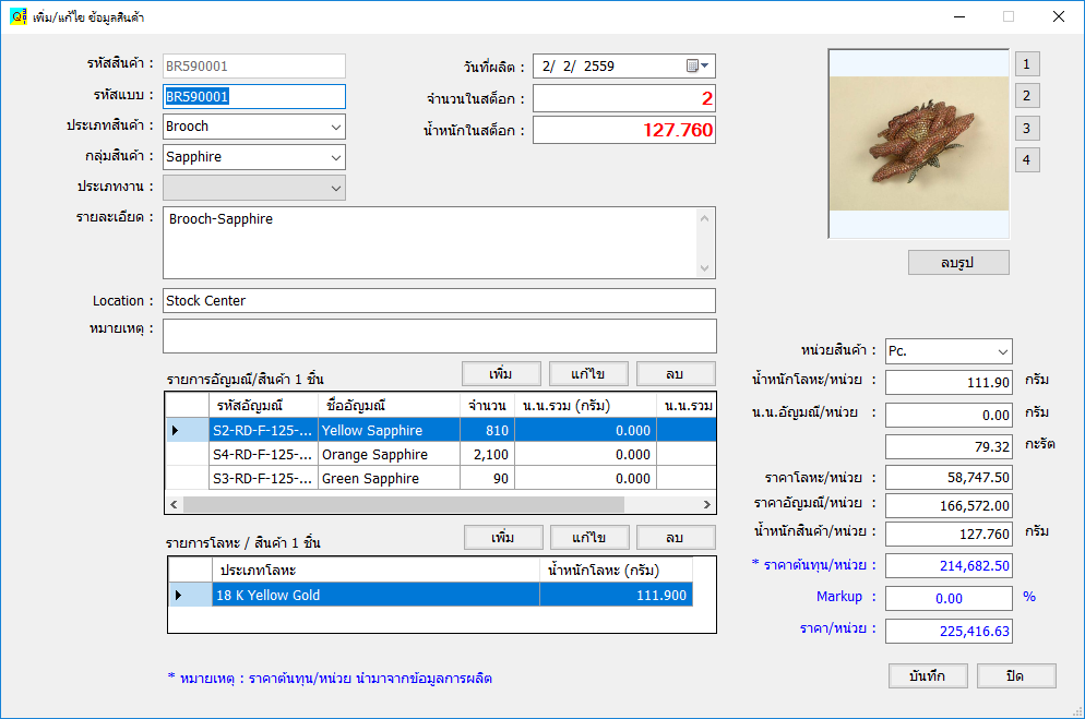 - สามารถเก็บข้อมูลโมเดลสินค้าและโมเดลชิ้นส่วน แต่ละชิ้นว่าใช้โลหะชนิดใด ใช้เพชร-พลอย ใดบ้าง เก็บอัตราค่าฝัง ค่าชุบ และสูตรของราคา หรือ ในแต่ละวัน เพื่อให้ง่ายสำหรับการโค้ดราคาให้ลูกค้า